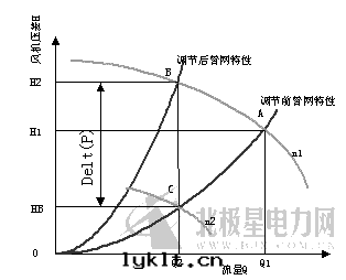 成(chéng)正(zhèng)比;如(rú)果(guǒ)采用(yòng)調速控制方(fāng)式,風(fēng)機(jī)轉(zhuǎn)速由(yóu)n1下降到n2,其(qí)管(guǎn)网(wǎng)特(tè)性(xìng)並(bìng)不(bù)發(fà)生改變(biàn),但風(fēng)